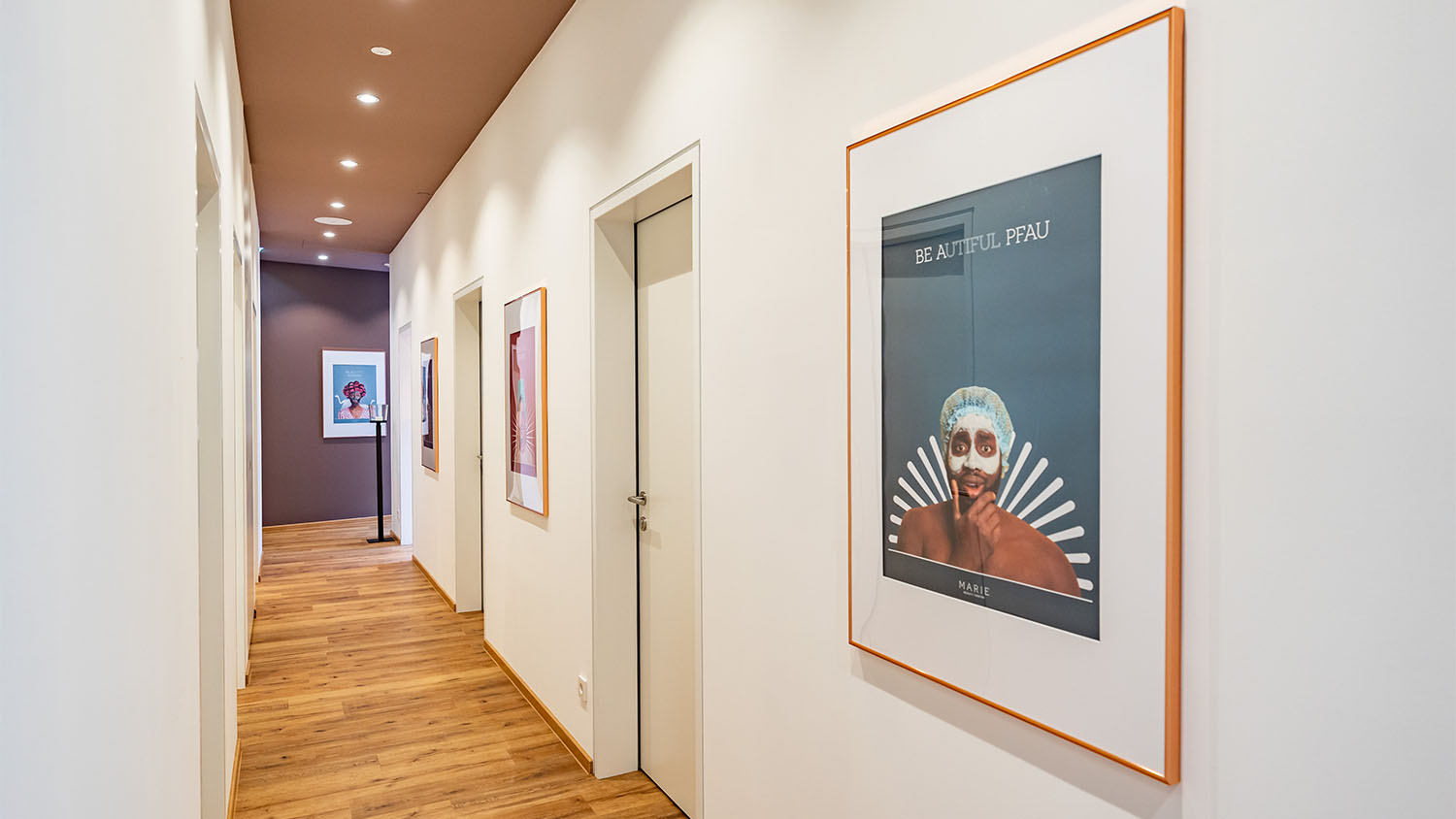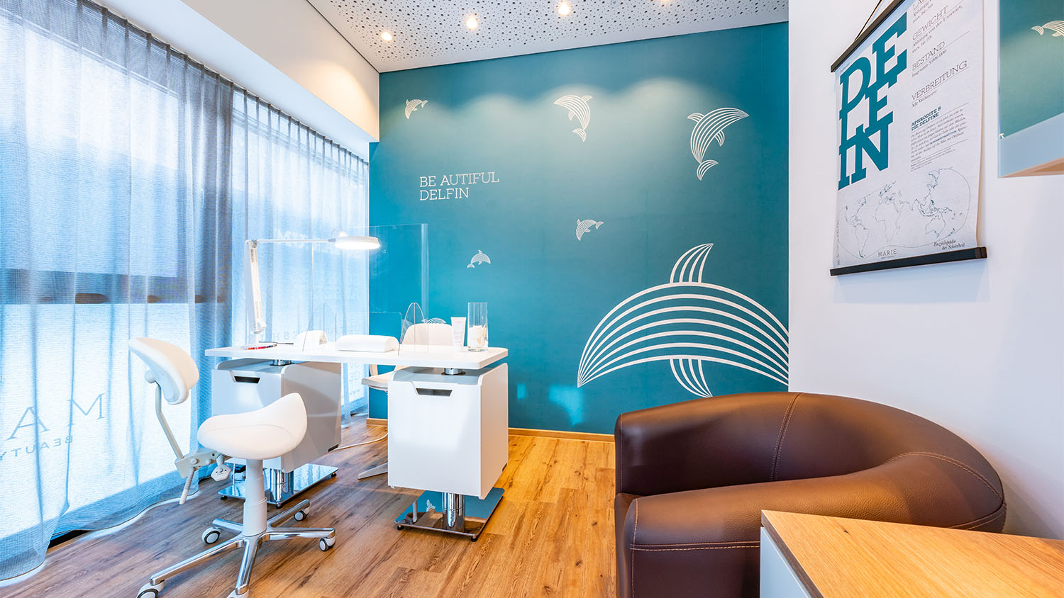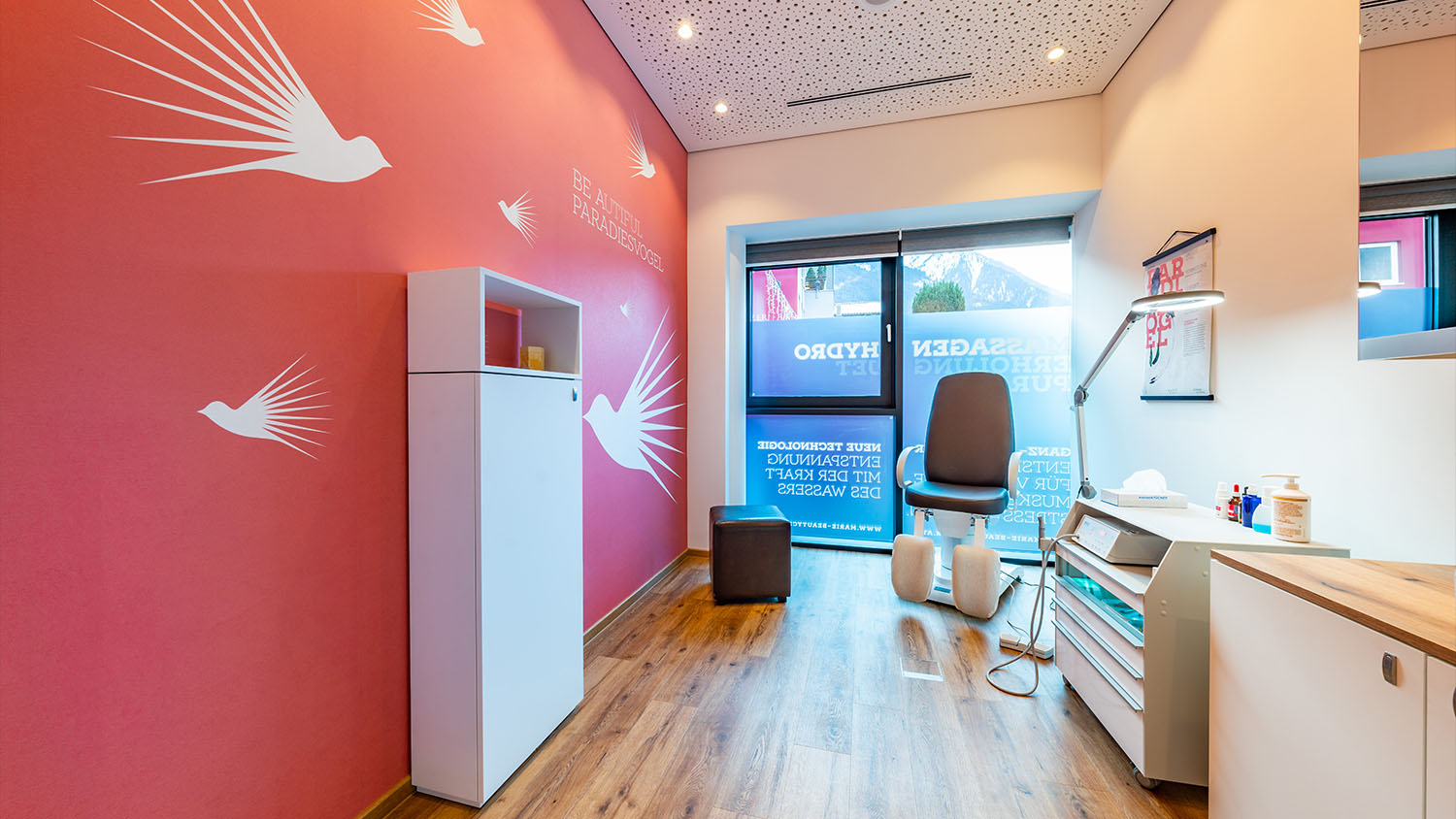 In Zusammenarbeit mit dem Architekturbüro inform aus Feldkirch, wurde der Fokus auf die Innenraumgestaltung gelegt. Sowohl für die betriebsinterne Kommunikation, als auch zur Herstellung eines geordneten und trotzdem vielfältigen Eindrucks auf die Kundinnen und Kunden, war eine gute Unterscheidbarkeit der einzelnen Behandlungsräume sehr wichtig. Stilistisch musste natürlich dennoch ein roter Faden erkennbar sein, der die Räume miteinander verbindet.